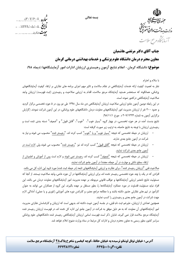 نظر به اهمیت کیفیت ارائه خدمات آزمایشگاه، آزمایشگاه مرجع سلامت وزارت متبوع اقدام به ارزیابی صلاحیت و رجیستری ارزیابان واجد صلاحیت آزمایشگاهی در کشور نموده است و در این رابطه در آزمون جامع ارزیابی صلاحیت ارزیابان آزمایشگاهی که در دی ماه سال 1398 در 5 حوزه تخصصی و شرکت بیش از 300 نفر از ارزیابان مدیریت امور آزمایشگاه های معاونت درمان دانشگاه های علوم پزشکی سراسر کشور برگزار شد