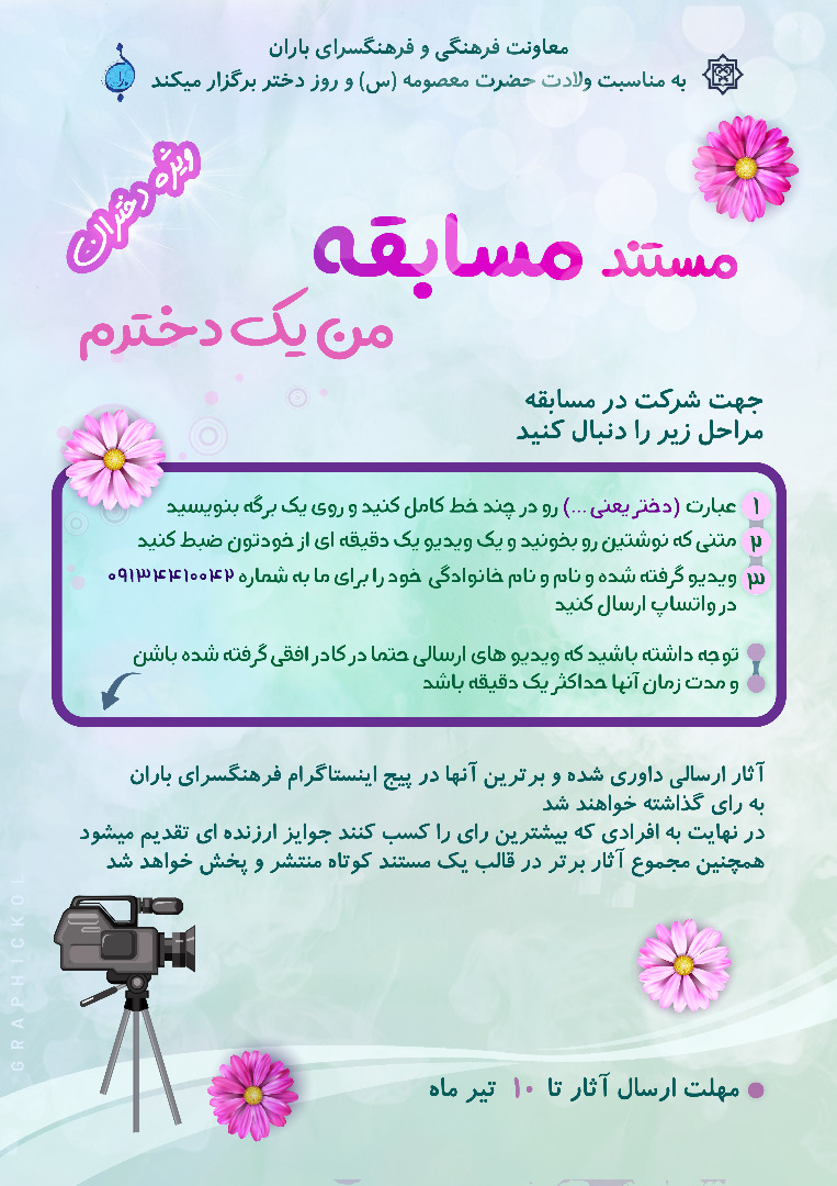 به گزارش روابط عمومی نهاد نمایندگی مقام معظم رهبری در دانشگاه، جهت شرکت در ساخت مستند عبارت "دختر یعنی ... " را در چند خط کامل و آنرا به صورت فیلم 1 دقیقه ای به صورت افقی تهیه و به شماره 09134410042 در واتس آپ ارسال نمایید.