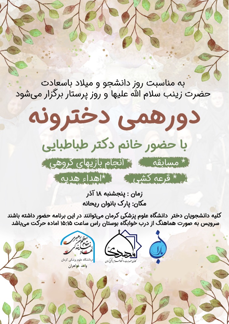 به گزارش روابط عمومی نهاد نمایندگی مقام معظم رهبری در دانشگاه، با همکاری واحد خواهران نهاد رهبری، فرهنگسرای باران و کانون مهدویت دانشگاه علوم پزشکی کرمان به مناسبت روز دانشجو و روز پرستار "دورهمی دخترونه" ویژه دانشجویان دختر دانشگاه علوم پزشکی کرمان برگزار می شود.